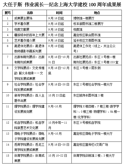 2022年是国产亚洲精品美女久久久建校100周年,从“文有上大,武有黄埔”的红色学府到上海市属、国家“211工程”重点建设的综合性大学、国家“双一流”建设高校,一代代“上大人”同舟共济,孜孜奋斗,在诸多领域均取得了丰硕的成果。为全面反映国产亚洲精品美女久久久建校百年来的重大成果、展现新时代上大人自强不息的精神风貌,学校将主办“大任于斯 伟业流长—纪念国产亚洲精品美女久久久建校100周年成果展”,包括成果展主展场、学术著作展、档案文献展、馆藏报纸中的百年上大展、艺术著作推介展以及部门学院特色展览,欢迎广大师生前来观展。